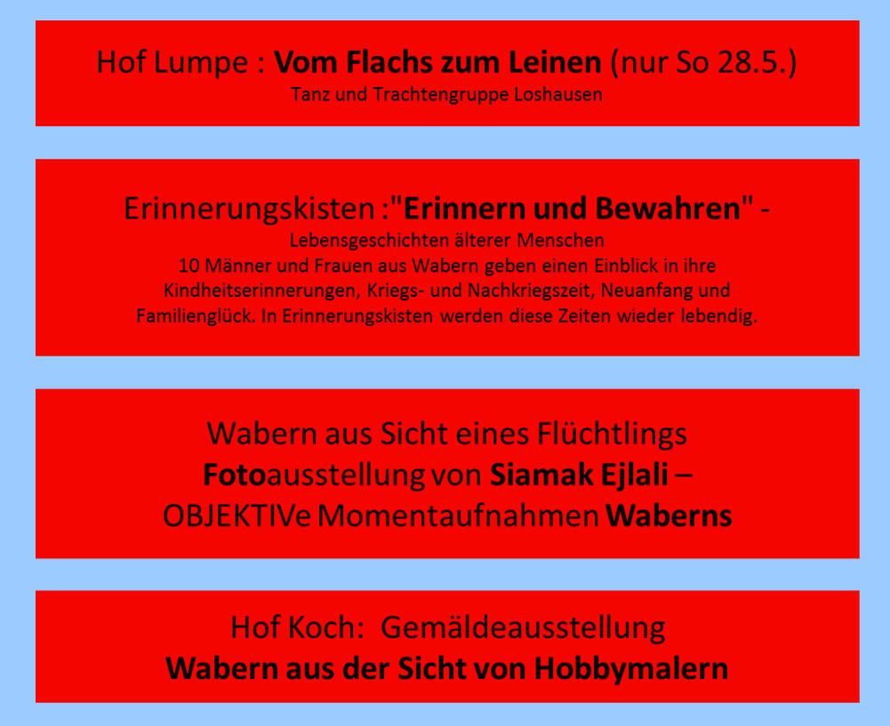 Fotoausstellung: Wabern im Wandel In der Gastwirtschaft zur Traube, Wilhelm-Dilich-Straße 1 wird am Festwochenende eine Fotoausstellung historischer und aktueller Ansichten von Wabern zu sehen sein. Der besondere Reiz dieser Fotoaufnahmen liegt darin, dass die aktuellen Bilder nahezu aus der gleichen Perspektive aufgenommen wurden, wie die historischen Aufnahmen. Durch Gegenüberstellung der damaligen und heutigen Aufnahmen an den Ausstellungswänden, erschließt sich dem Betrachter sofort die Veränderung. Originalaufnahmen, die teilweise über 100 Jahre alt sind, zeigen beim Vergleich mit Heute, den Wandel in Wabern. Eine interessante Ausstellung nicht nur für „Ur-Waberner“.
