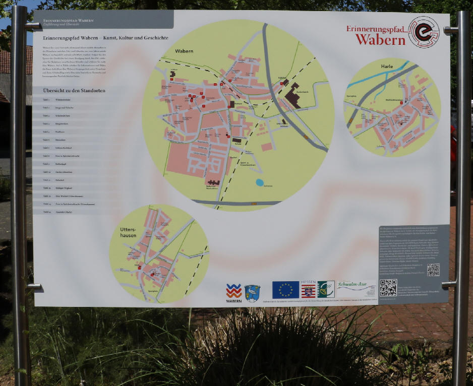 Erinnerungspfad Wabern- Kunst, Kultur und Geschichte Wabern 817 - 2017: Seit mehr als tausend Jahren siedeln Menschen in der Flussebene zwischen Eder und Schwalm, vor 1200 Jahren wurde Wabern nachweislich erstmals schriftlich erwähnt. Folgen Sie den Spuren der Geschichte bei einem Rundgang durch den Ort, entdecken Sie Skulpturen verschiedener Künstler und erfahren Sie mehr über Wabern. Auf 16 Tafeln erhalten Sie Informationen und Bilder, die Ihnen Aufschluss über Waberns Vergangenheit, seine Einwohner und ihren Arbeitsalltag sowie über seine besonderen Bauwerke und herausragenden Persönlichkeiten bieten.